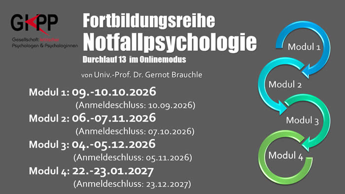 seit 1994 veranstaltet die GkPP gesetzlich geregelte Curricula, wie der Lehrgang KP und GP, die Spezialisierungslehrgänge im Bereich der Kinder-, Jugend- und Familienpsychologie und Gerontopsychologie, A&O-Angebote für die Zertifizierung und die Fortbildung danach, Notfallpsychologie und freie Seminare, die für verschiedene Bereiche anrechenbar sind.