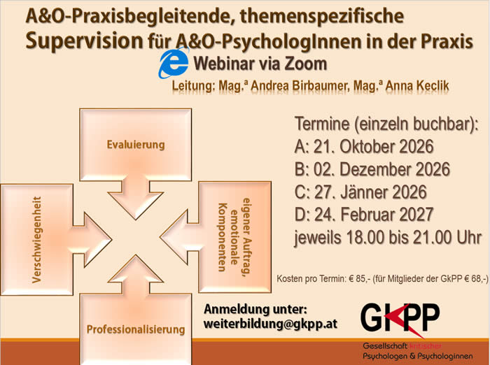 wir möchten Ihnen besonders empfehlen unsere Gruppensupervision (Sem.Nr.: E.ApSv/A-D), die wir sehr kostengünstig anbieten. Wir starten wieder mit diesem Angebot im Herbst 2026, 4 Termine mit je einem speziellen Thema aus der Praxis der A&O-Psychologie. Mehr Informationen hier anklicken.